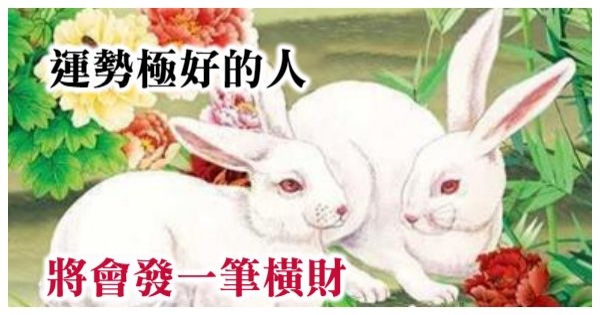 屬兔的人,橫財大運好風景,全在下半年裡來,而今年沖太歲的格局,年底方可化解,因此眼下苦一些毫不可怕,年底自有風生水起橫財來!屬兔人雖然低調,但是很有主意,腦子裡的創意有時只是沒有很好的得到發揮,而今年的年底,屬兔人事業再創輝煌,職位晉升,所以自己一直以來想做的事情得以成真,沒准還能一發不可收拾,賺足百萬不是理想,數錢還離不開點鈔機,最不缺的就是錢!