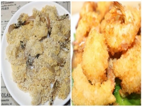 4,把所有的蝦仁都沾上雞蛋液,再沾滿麵包粉。