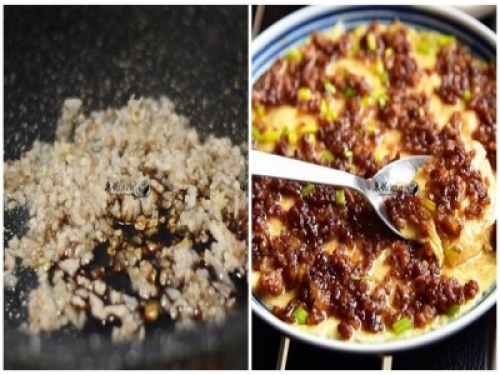 8把炒好的肉糜放在蛋羹上面,蒸1分鐘,讓雞蛋和肉末互相滲透一下,撒上蔥粒就可以上桌了。