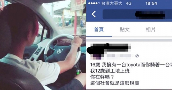 有一位16歲的青少年在臉書PO文且附圖:「16歲,我擁有一台toyota,而你騎著一台垃圾many。我12歲到工地上班,你在幹嗎?這個社會就是這麼現實。」