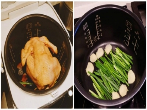醃制好後,鍋底鋪上蔥和生薑,將雞肉和醬料一起放入然後按下煮飯鍵就可以等待出鍋啦