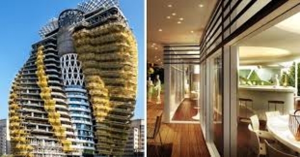 一樓大廳是公共空間還有車用電梯!而這棟綠建築也會種植兩萬五千棵喬灌木,結合建築和大自然打造森林氣息!