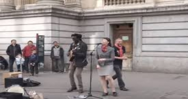 這一件事情就發生在比利時布魯塞爾的街頭上!有一位黑人街頭藝人邊彈吉他邊演唱「Three Little Birds」這首歌,沒想到有一位OL大概太想要唱歌了,竟在他唱著唱著的時候,突然亂入啦!XD