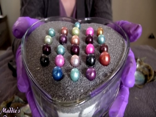 之後她用桌面的抹布將珍珠擦拭乾淨,將彩色珍珠放到裝有灰色海綿的盒子裡。