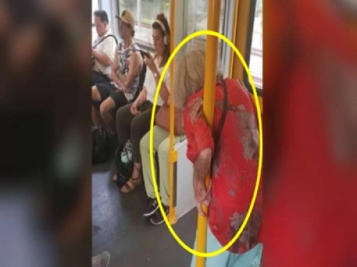 據《7 News》報導指出,照片中可見有位身穿紅衣、滿頭白髮的駝背老婆婆站在車廂內,吃力地用一隻手臂緊抓欄杆。在她面前的一排座位上,卻有四個年輕人安穩地坐著,有人正低頭滑著手機,有人雙手抱胸雙眼放空,也有人一直看著阿嬤,但似乎沒人要讓座給駝背嬤的意思。