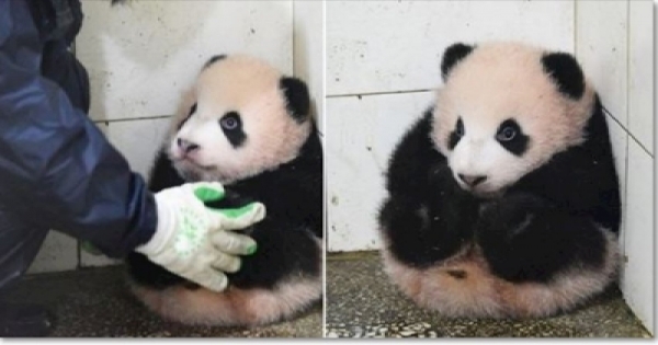 這隻熊貓寶寶被打掃阿姨抱起來放到牆角,不讓牠打擾清潔工作,阿姨還跟熊貓寶寶說「等我一下,等下把你抱回去,別亂動」,結果⋯⋯