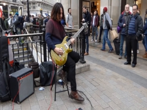 吉他手披散頭髮在路邊拉椅子坐著,隨興的街頭演奏,卻讓路過的人超震驚:根本就是live會場!!!