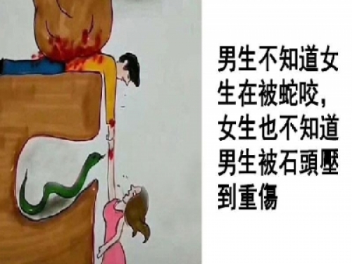 女生也不知道其實男生被石頭壓到快不行了。」