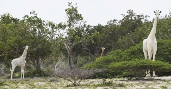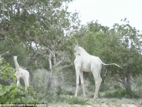 為什麼特別呢?因為這對一大一小的長頸鹿都是「白色」的啊!他們被人目擊到正悠閒的在樹叢間散步,看起來相當優雅!