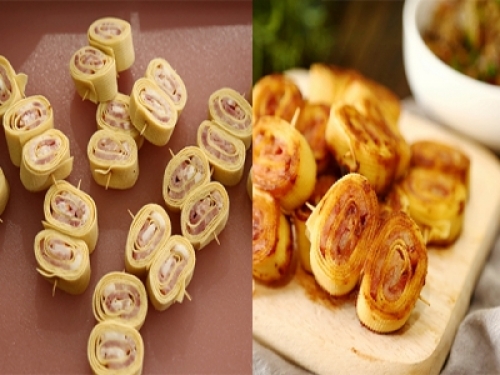 5、用牙籤穿起來,一根牙籤上穿兩個培根豆皮卷。