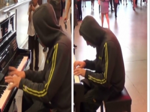 這次的影片,在地鐵車站旁的地下大廣場旁,就擺了一架鋼琴,而一名打扮低調,特意帶上連帽衫帽子的男子,就在那演奏了起來~~~