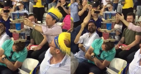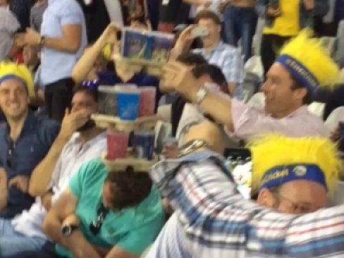 根據媒體報導,這名男子在觀眾席上熟睡,想不到竟然被後面的觀眾玩弄,因為他用一個很奇特的姿勢睡著,後面的人就趁這個機會再他的脖子跟頭之間放上杯子,然後就這樣一層又一層的疊了起來,原本以為疊兩層已經很厲害了,想不到竟然還可以疊到第三層,最後成功疊上去時,在場的觀眾還紛紛舉手歡呼~等等,你們不是來看球賽的嗎?現在這樣是在??