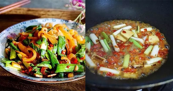 7、接著放入蒜葉,翻炒20秒就關火。