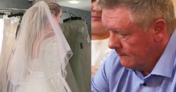 當她在試衣間裡換裝時,爸爸滿心期待地在外頭等著,就怕一不小心就錯過女兒穿上婚紗時的風采,但萬萬沒想到,當女兒一走出來那剎那,他的臉瞬間垮了,他完全愣住了。