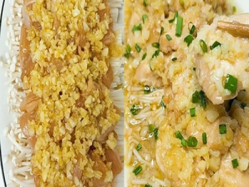 蒜蓉金針菇蒸雞胸肉,鮮嫩無比美味好吃,吃過幾次就上癮!