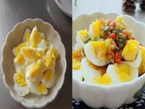雞蛋切成塊狀擺入盤中,把調好的料汁淋在上面即可。
