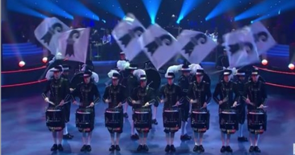 在這場2014年的表演中,他們完全改寫大家對鼓樂隊的想像。表演一開始,穿著軍裝的鼓樂隊嚴肅得進場,他們全部低著頭、非常嚴肅。