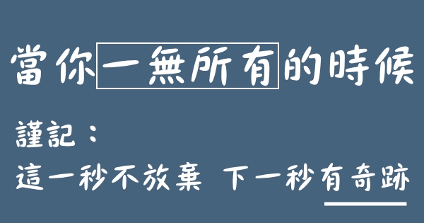 當你一無所有的時候,謹記:「這一秒不放棄,下一秒就有奇跡!」