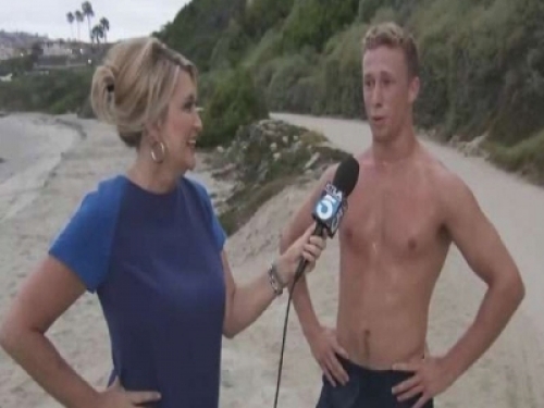 這位帥哥路人剛早晨沖完浪,全身肌肉超健壯又性感,於是溫蒂訪問她關於鯊魚的問題。