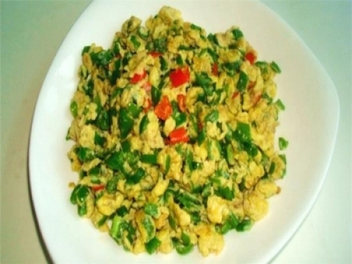 4、熱鍋加涼油,最好花生油,燒至六成熱將攪拌好的雞蛋辣椒倒入鍋中,待稍成型加入少許食鹽,顛勺翻身,待成型出鍋,這樣美味的雞蛋抱辣椒就成功啦!