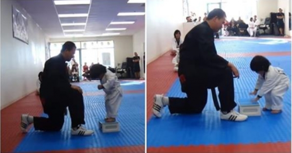 這是位在美國加州特曼庫拉市(Temecula)一間跆拳道館,所舉辦的升級考試,這個小男孩要準備擊破事先準備好的木板,才能取得晉級資格,貼心的教練還在考試前不斷指導小男童腳踢的秘訣,而男童也重複練習多次,結果居然!