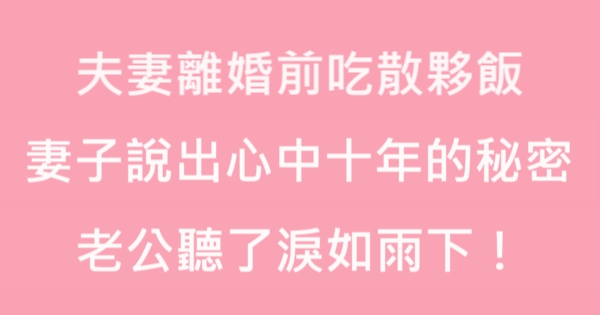 大家好,我是 Choco 今天來跟你說說 夫妻離婚前吃散夥飯,妻子說出藏在心中十年的秘密,老公聽了淚如雨下!吧!讓我們來看看!