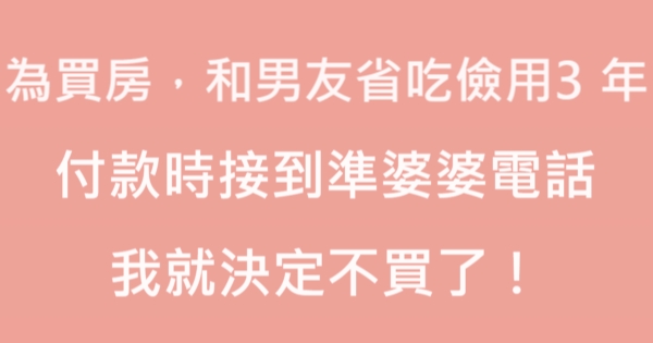 哈摟哈摟親愛的大家~~我是有錢人這麼想小編Pineapple!今天要來說說關「為了買房,和男友一起省吃儉用3年,付款時接到準婆婆電話,我就決定不買了!」的事件!讓我們一起來看看吧!