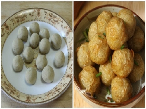 鍋裡倒入油,燒至7、8成熱時放入馬鈴薯丸子,用小火炸至變色即可,撈出丸子撒上蔥花。