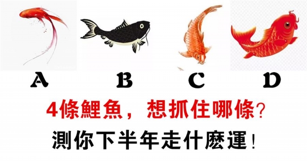 一個好的運勢可以帶給人好的財富、家庭、事業乃至更多,只要能擁有一個好的運勢不管做什麼都能順風順水。每個人運勢有好有壞,不同的人運勢不一樣,假如有4條鯉魚,想抓住哪條?測你下半年走什麼運!注:心理測試只是提供一定的參照,答案僅供參考,三分天註定,七分靠自己,祝大家開心幸福。