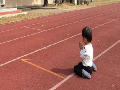 媽媽將天真兒子的模樣拍照上傳,在臉書社團《爆廢公社》上發文,只見男童虔誠地跪在操場上,雙手合十,一臉認真地向前方神明拜拜,隨著他的視線一起看過去...