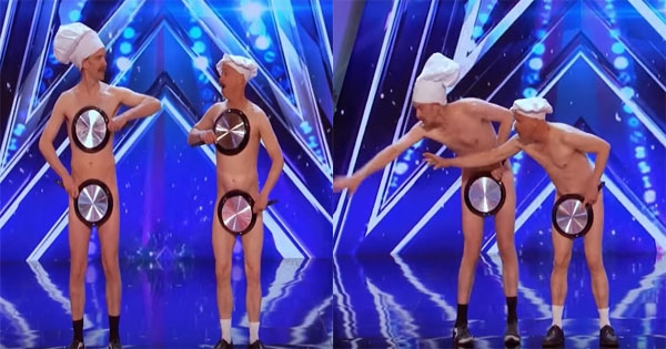 只見他們倆個帶著廚師帽左右手各拿一支平底鍋,就大辣辣地走上台,搞得評審還低頭看看他們是不是真的光著身體,音樂一下,兩人開始表演,先是把鍋子上下移動,或是一支擋前面一支擋後面的,大膽直接轉身,還時不時翻轉平底鍋,讓人看了目不轉睛。