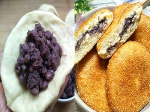 11、厚厚的金黃色大餅包裹著香甜軟糯的紅豆沙,叫人咬上一口,香到胃裡,甜到心裡,喜氣而美味,大人小孩都喜歡。
