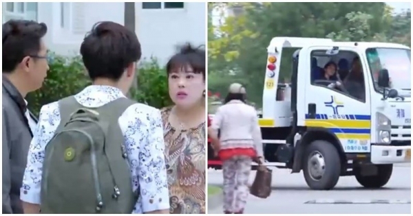 鏡頭一轉,可以看見一台拖吊車緩緩駛過來,令人訝異的是副駕駛上坐著的竟是這名老公的妻子,也正是兒子的媽媽,只見她要駕駛在前面等一下,自己先下車。
