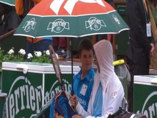 當年由於突如其來的雨水中斷了比賽的進行,使得諾瓦克不得不暫停比賽並到一旁的椅子上休息,此時後方的球僮也立刻站在後面替諾瓦克撐傘!不過...
