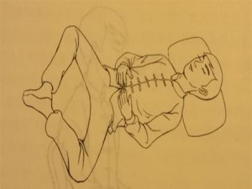 頭向右側身而臥,右腿屈,左腿伸;右手抱肩,左手覆按床面,自然舒適。