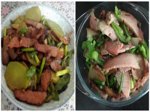 蒜苔,臘肉,紅辣椒,酒半小匙,胡椒粉少許,鹽少許,糖少許