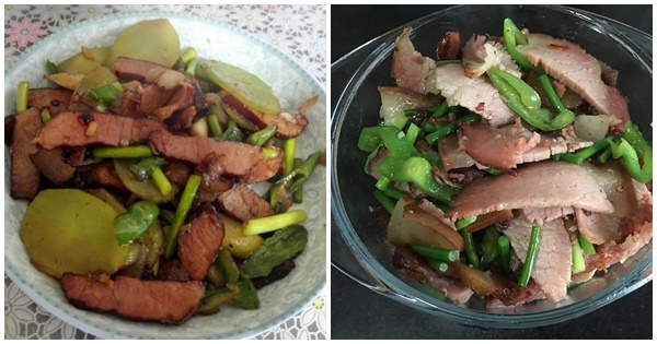 2、鍋中燒熱1大匙油,放入臘肉爆炒至呈現透明後,再放入蒜苔和紅辣椒