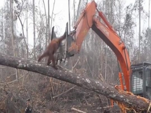 國外有一紅毛猩猩見到家園被怪手摧毀,