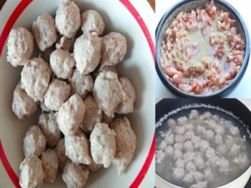 5、煮鍋中添加足夠的清水,用小勺把肉餡兒團成一個個的小丸子,