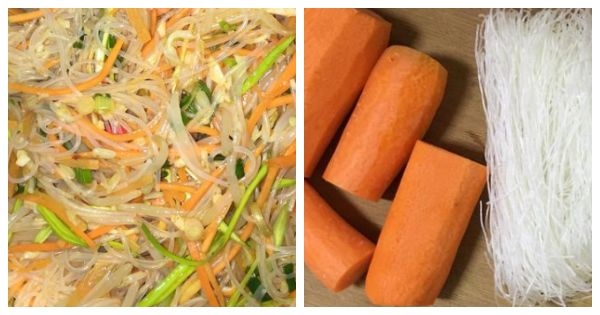 1 .首先把胡蘿蔔去皮後清洗乾淨,切成兩半,取粉絲兩小把。