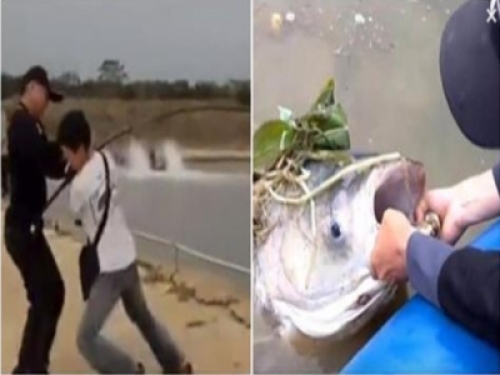 當然,釣到了大獵物,這名男子怎麼會捨得放過,立刻叫來自己的同伴把這條大魚撈上來。