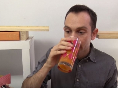 剛剛喝的果汁被機關給拌倒,流了出來,不過不用擔心,果汁沿著管線流到下面的杯子去