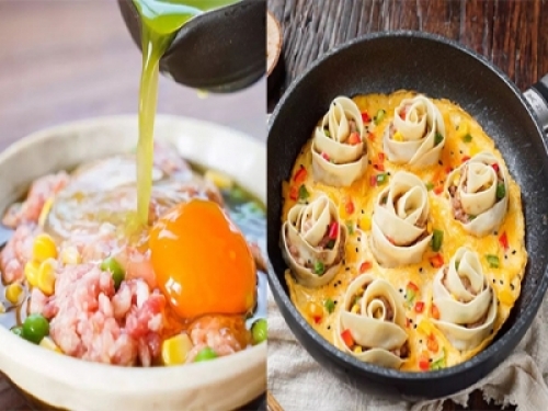 一隻只玫瑰花形狀的餃子在平底鍋裡冒出“滋滋”的聲音,玫瑰花擁抱了金燦燦的蛋底。