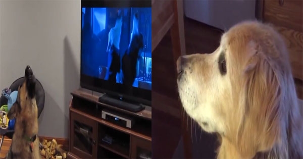 看到一隻狼犬原本趴在客廳休息,當電視播放出狼嚎的下一秒,神奇的事情發生了,牠居然耳朵豎起來也跟著電視裡的狼一起叫了起來,忘情的吼著,完全聽不下來XD