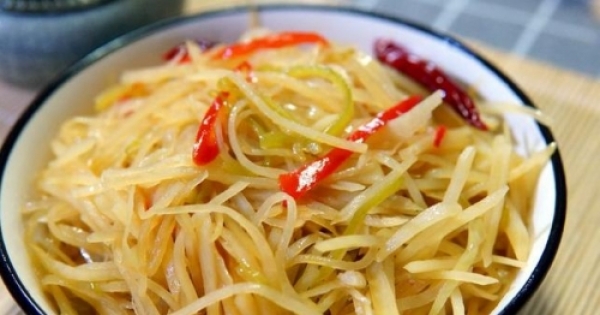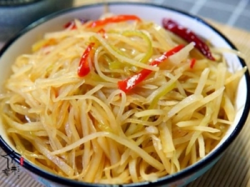 再加入剛剛洗乾淨的馬鈴薯絲,繼續拌炒,等到馬鈴薯絲炒到有點發軟後,再加入白醋,這樣可以讓馬鈴薯絲充分吸收!
