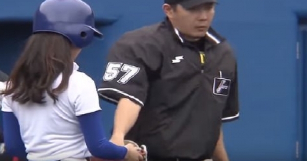 好害羞!嚴肅的棒球主審不敢直視女球僮!一轉身大家都懂了這「胸前超彈的大球」不能錯失良機!