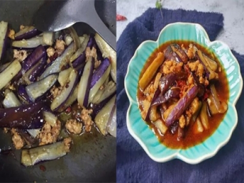 7.下茄子翻炒均勻。
