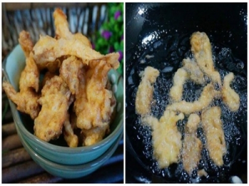 3. 鍋中放入適量油,油6分熱時,放入裹好蛋液的平菇。炸至金黃。