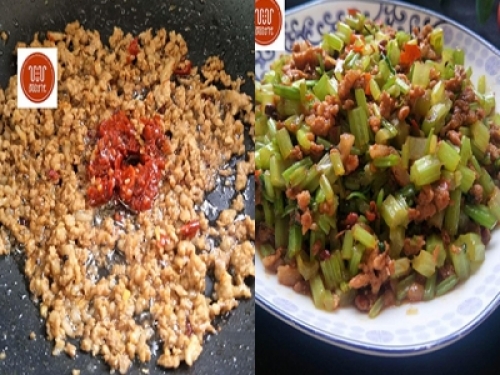 夏天的氣候很乾燥,常常會感到口乾舌燥氣喘心煩,身體不適,常吃些芹菜有助於清熱解毒,去病強身。肝火過旺,皮膚粗糙及經常失眠、頭疼的人可適當多吃些。今天這道芹菜炒肉末,我家隔三差五就做它,此菜口感爽脆,味道微辣,顏色翠綠,特別簡單的一道家常菜,老少皆宜,炒一了盤,很快被我們娘倆解決掉了,下飯挺不錯的,既下飯又便宜,怎麼吃都吃不夠!