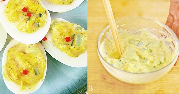 3. 將蛋黃碾碎,加入黃瓜丁、白醋、鹽、黑胡椒粉和沙拉醬拌勻。
